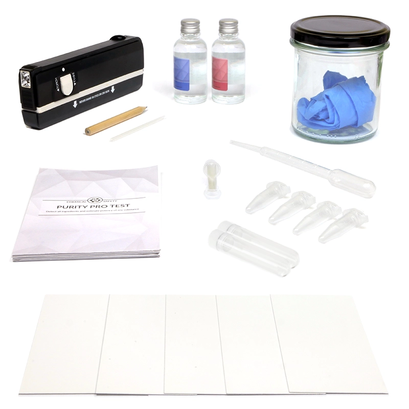 Pakkaukseen sisältyy: käyttöopas, hanskat, 4 koeputkea, 5 testauskorttia, testipurkki, pipetti, testausneste (40 ml), 20 lasiputkea, MDMA:n pitoisuusprosentin asteikko ja UV-C-taskulamppu (4 x AA paristo eivät sisälly pakkaukseen).